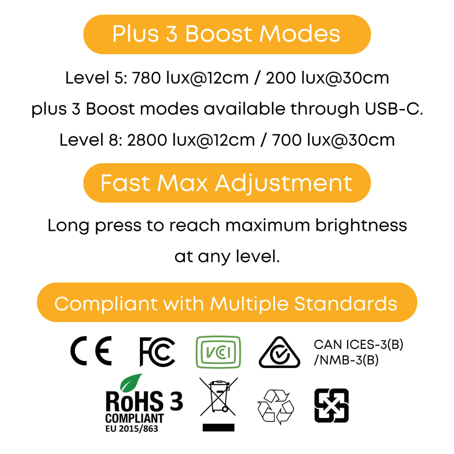 5 brightness levels via AA batteries (not included) and 3 additional boost modes via USB-C. 780 lux at 12 cm on level 5 and 2800 lux on level 8.