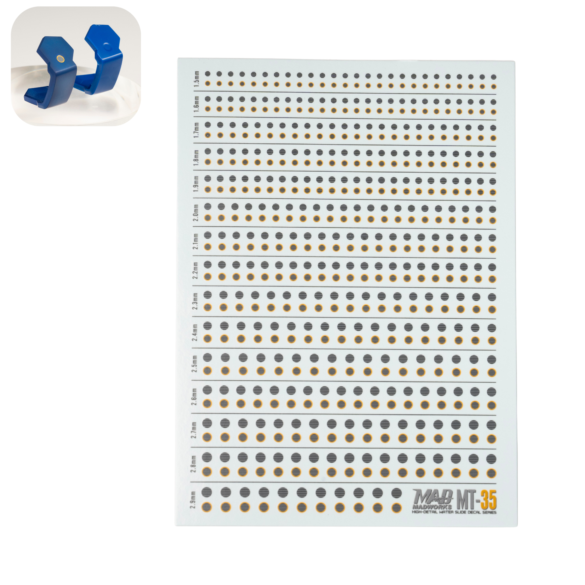 Verbessern Sie Ihre Modellbauprojekte mit dem MT-35 (S) Wasserschiebebild – Kreis. Erhältlich in Durchmessern von 1,5 mm bis 2,9 mm, ideal für präzise Details auf Modellen.